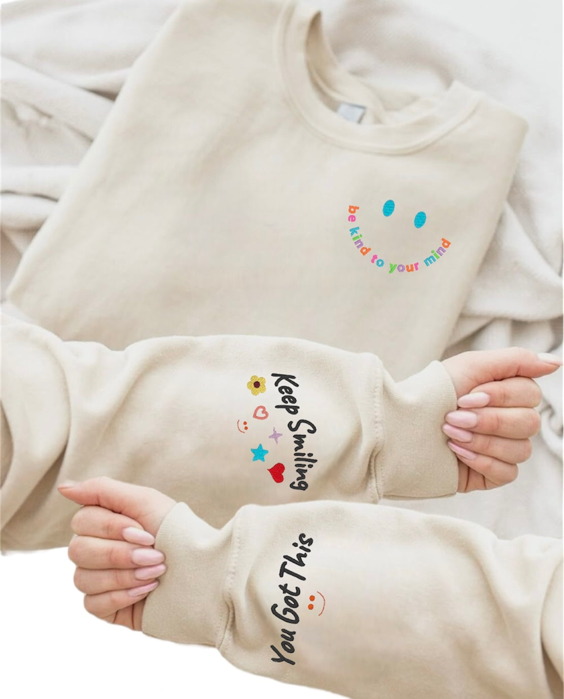 Embrace the power of positivity with our "Positive Vibes Only" Embroidered Sweater. The front features the uplifting "Be Kind to Your Mind" logo, while each sleeve carries its own motivational message—“Keep Smiling” on one sleeve and “You Got This” on the other. Designed to inspire and energize, this cozy sweater is perfect for spreading good vibes and confidence wherever you go.