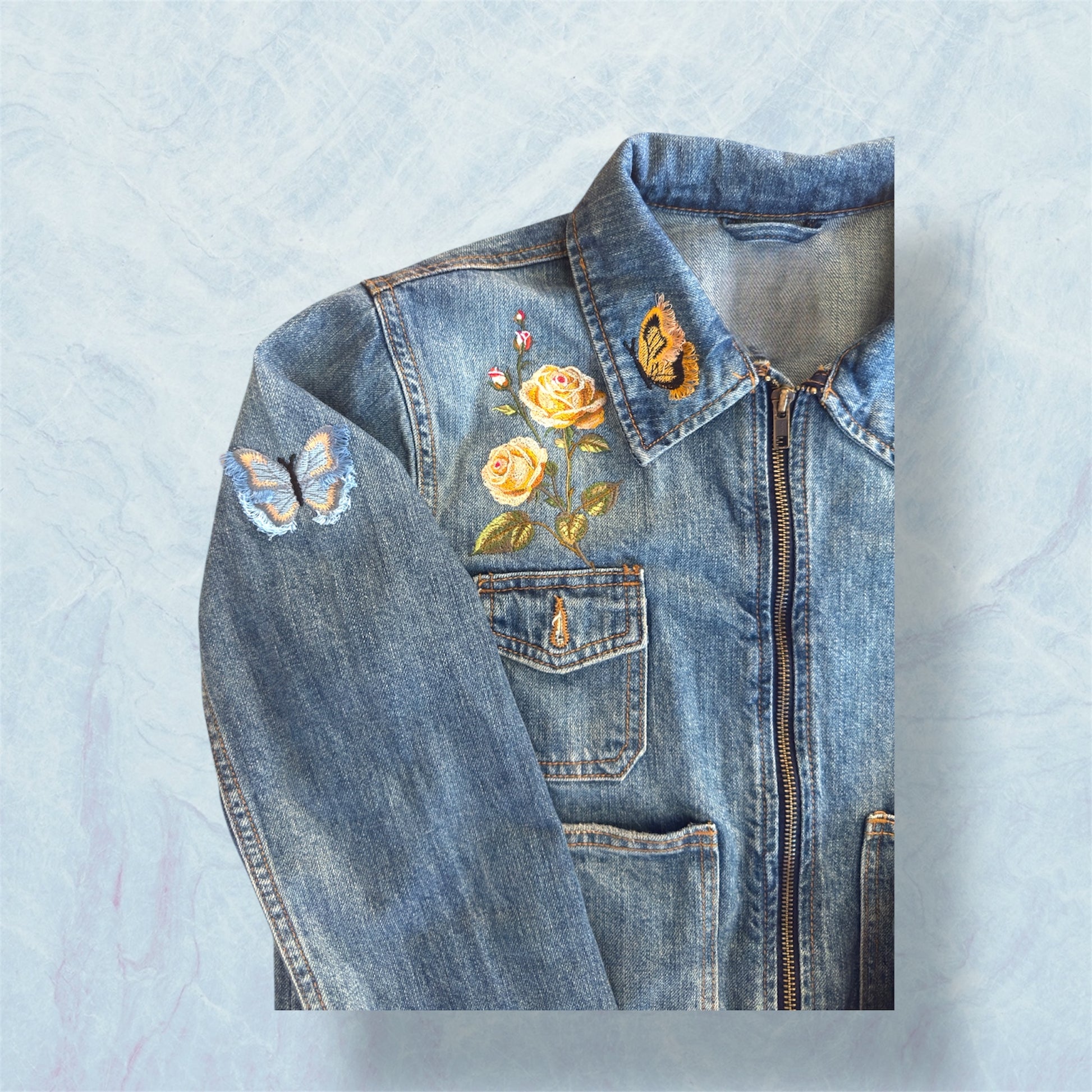 Women's Embroidered Denim Jacket - Floral and Butterfly Jean Jacket, Vintage Boho Style for Casual and Festival Wear